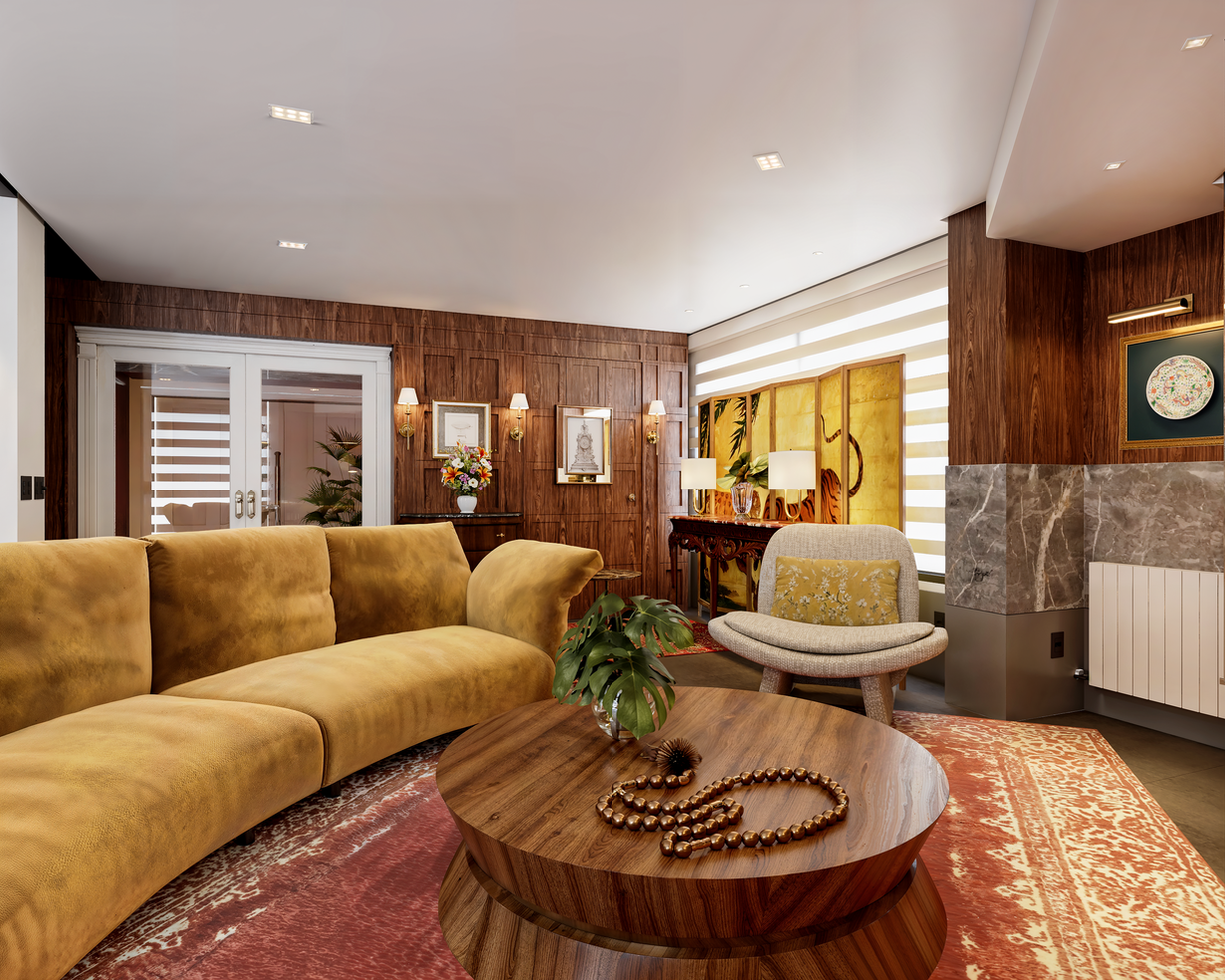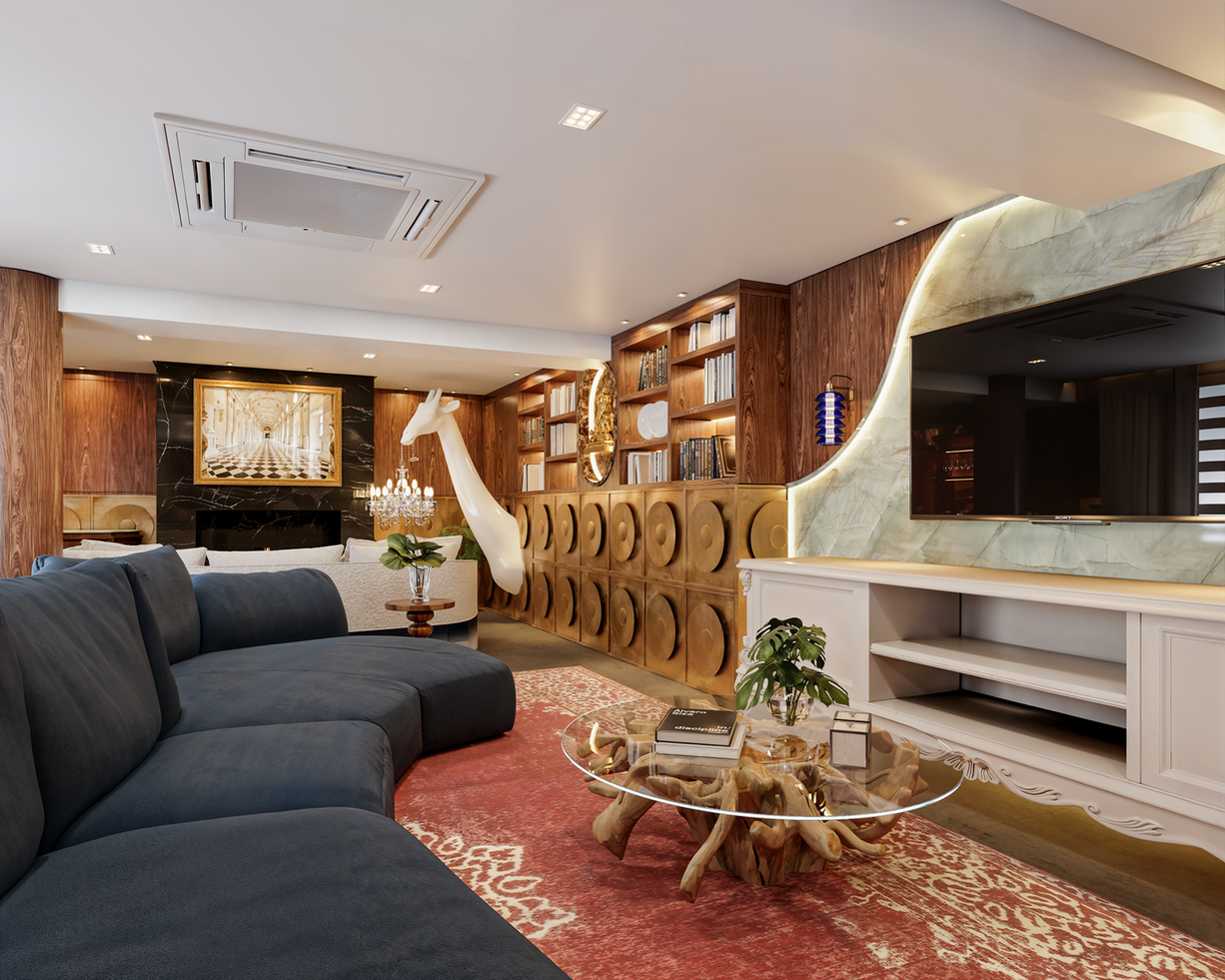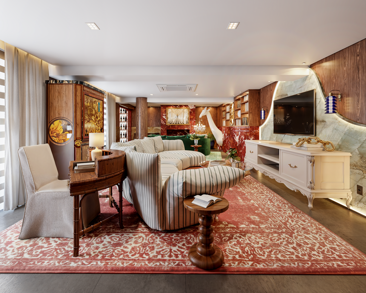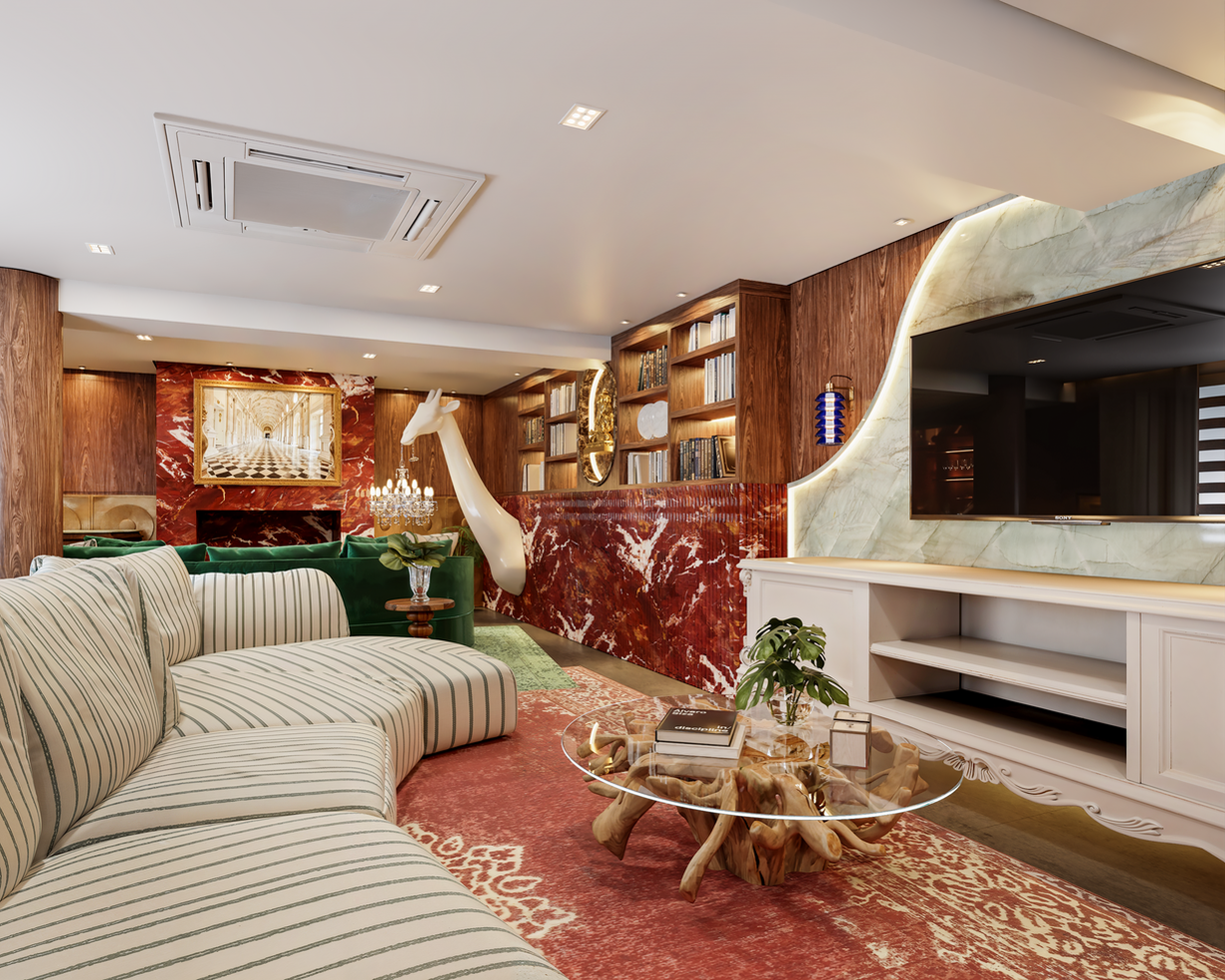 Neste projeto de áreas sociais, a presença da pedra nas paredes vai além da segurança — torna-se elemento estético e protagonista do espaço. Amantes das cores e da expressão, os moradores inspiraram ambientes vibrantes e afetivos, onde a extravagância se manifesta em detalhes ousados, composições ricas e uma energia cheia de vida. Um espaço onde o excesso tem equilíbrio — e a personalidade, liberdade.