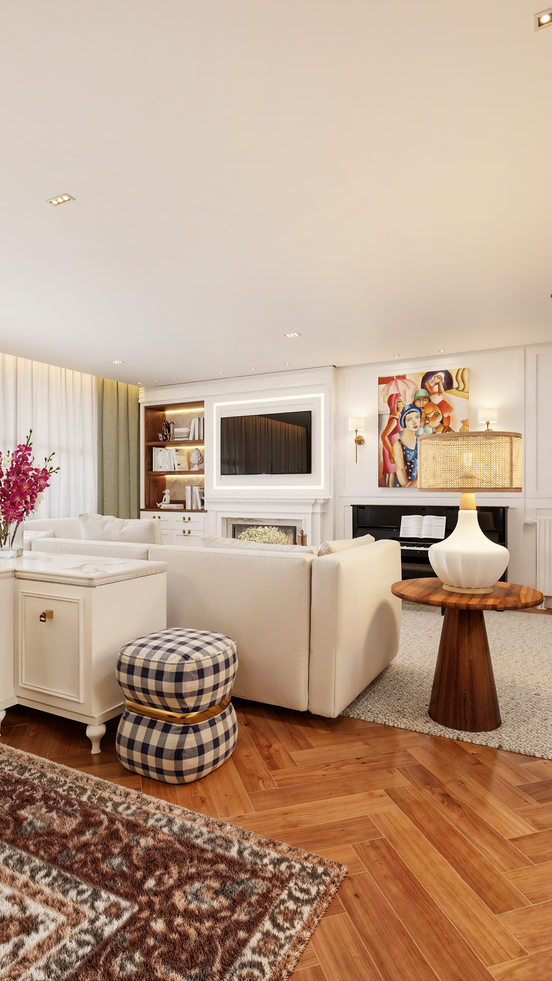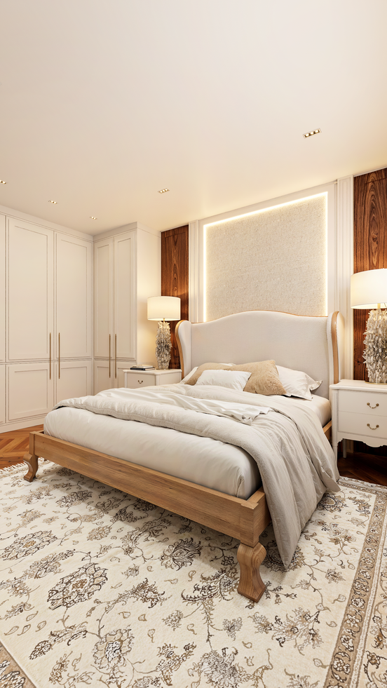 "Nesta suíte, os tecidos da Entreposto dão o tom da atmosfera envolvente e sofisticada. A parede da cabeceira se transforma em protagonista, com uma composição ousada de estampas e cores que dialogam entre si com harmonia e elegância. O resultado é um refúgio afetivo, repleto de texturas que aquecem e despertam os sentidos."