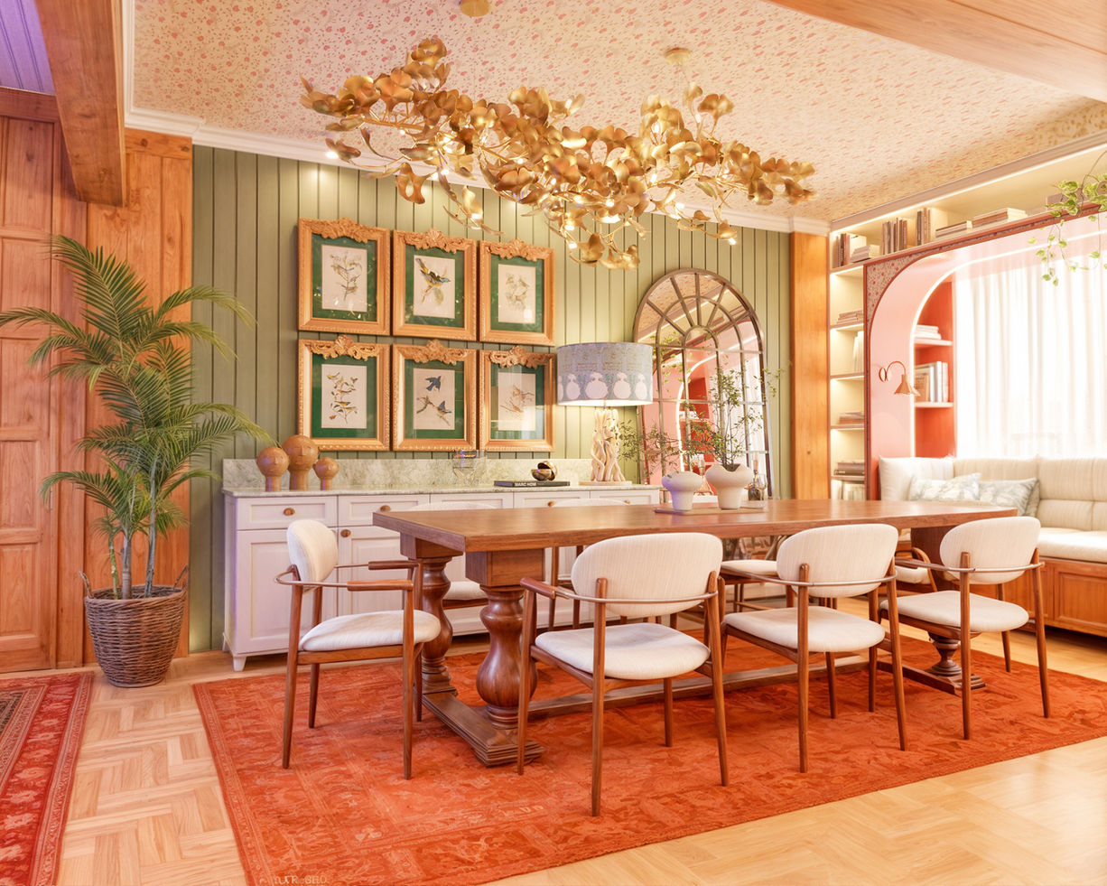 "Neste projeto, o clássico é reinterpretado com personalidade e ousadia. Formas tradicionais ganham nova dimensão através da madeira rústica, que traz calor e naturalidade, enquanto cores fortes e vibrantes percorrem móveis, tecidos e detalhes decorativos, criando contrastes surpreendentes. Cada ambiente foi pensado para equilibrar elegância, conforto e expressão, resultando em um espaço que celebra a história e a atemporalidade, mas respira com frescor e contemporaneidade."