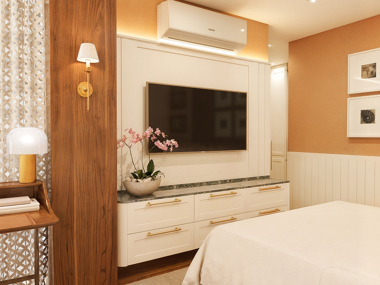 "Neste projeto, o clássico e o contemporâneo se encontram na medida certa. Formas tradicionais convivem com linhas atuais, enquanto cores fortes e vibrantes dialogam harmoniosamente com tons suaves e neutros. Cada detalhe foi pensado para criar espaços sofisticados, acolhedores e cheios de personalidade, onde a elegância atemporal se mistura à leveza do presente, resultando em um projeto que inspira calma, estilo e equilíbrio."