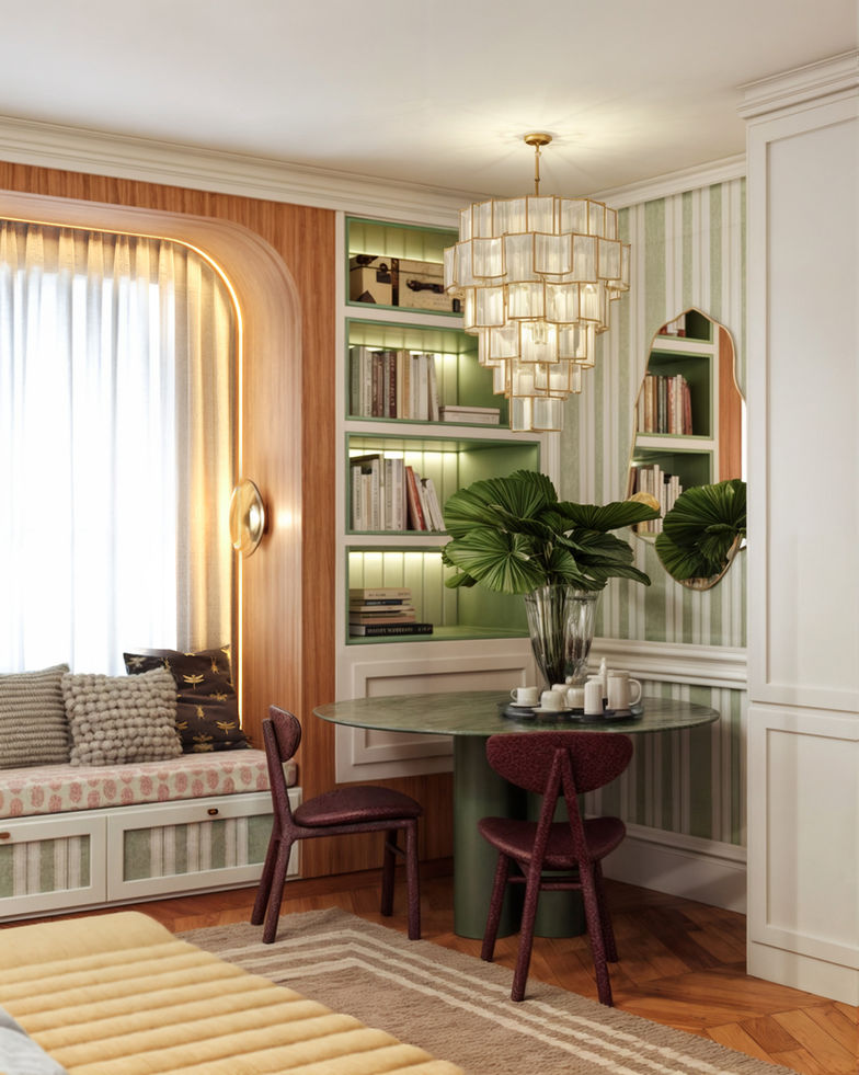 "Nesta suíte, os tecidos da Entreposto dão o tom da atmosfera envolvente e sofisticada. A parede da cabeceira se transforma em protagonista, com uma composição ousada de estampas e cores que dialogam entre si com harmonia e elegância. O resultado é um refúgio afetivo, repleto de texturas que aquecem e despertam os sentidos."
